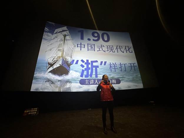 宣讲员做主题为《1.90,中国式现代化“浙”样打开》的微宣讲,紧扣党的二十大精神和最新时事政策。从2022年浙江城乡收入比“1.90”说开去,以两个“袋子”、一张“图”、一颗“瓜”为例,破解浙江城乡收入比连续十年缩小的“共富密码”,充分展示了中国式现代化的浙江实践。随后,全体党员干部共同观看电影《望道》。
