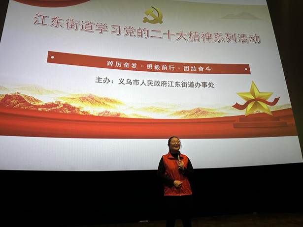 为深入学习宣传贯彻党的二十大精神,进一步丰富人民群众的精神文化生活,马克思主义学院、义乌创新研究院联合江东街道成立红货郎宣讲团,奏响校地协同宣讲“最强音”。4月3日晚上,第七场“党的二十大精神宣讲”系列活动走进义乌市吾悦星轶影城,江东街道机关第一支部全体党员干部参加。